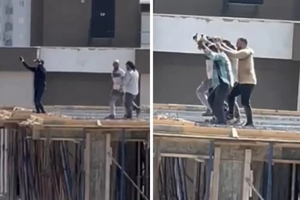Bir emekçi evvel elindeki kerpetenle birlikte dans etmeye başladı. Yerden metrelerce yükseklikte müziğin ritmine kapılan çalışana öteki arkadaşları da katılarak halay çekmeye başladı.