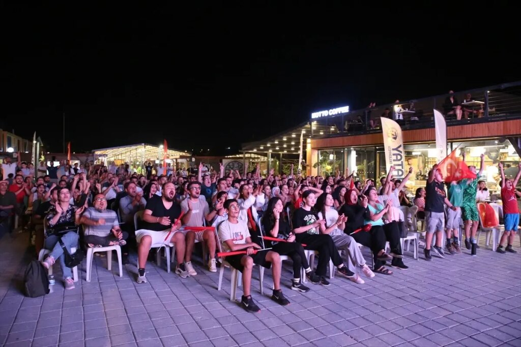 Büyükşehir Belediyesince kurulan dev ekranda maçı heyecan içerisinde takip eden vatandaşlar, bayraklarla ulusallara maç uzunluğu takviye verdi.