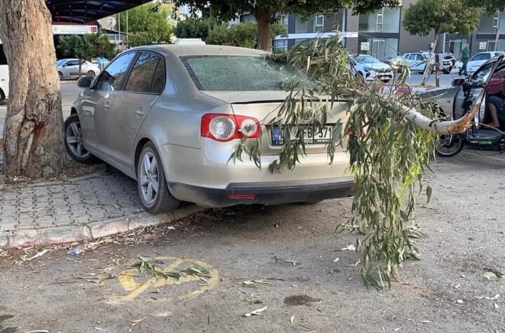 Faziletli ilçesinde rüzgar nedeniyle kırılan ağaç kolu, park halindeki bir arabanın art camını patlattı.