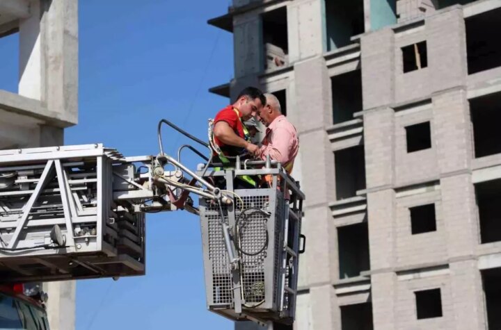 Mersin'de dış cephe çalışması sırasında 13. katta iskelede mahsur kalan 2 personel, itfaiye grupları...