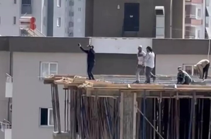Adana'nın Sarıçam ilçesinde inşaatta çalışan çalışanlar, arabadan gelen müzik sesiyle birlikte yüksek katlarda halay...